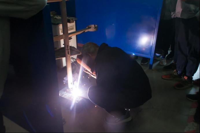 郭老師正在為同學們講解焊接的手法以及焊接速度、角度等問題。
