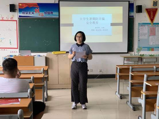班會通過觀看視頻,案例分析等方式讓學(xué)生了解不同的詐騙形式和手段,輔導(dǎo)員老師根據(jù)一些詐騙的具體案例,告訴同學(xué)們識破騙局的方式方法,并就近期較為猖獗的詐騙案件(校園貸、電信詐騙等)和同學(xué)們一起討論,并提醒同學(xué)們在暑期或離校實習(xí)期間更要提高安全意識,不要給不法分子留下可乘之機。