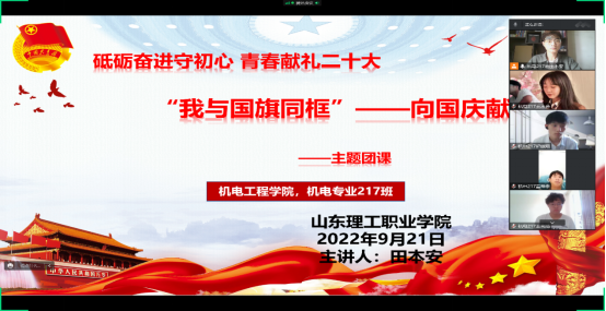 喜迎國慶、舉國同慶。為大力弘揚愛國主義精神,進一步引導(dǎo)廣大青年學(xué)生深入學(xué)習(xí)貫徹習(xí)近平新時代中國特色社會主義思想,使得更多理工的優(yōu)秀青年學(xué)子表達自己的愛國之心,能夠?qū)I(yè)學(xué)習(xí)與兩會精神緊密結(jié)合,參與到護旗愛國行動中當(dāng)好黨的助手和后備軍。以實際行動迎接黨的二十大勝利召開,機電工程學(xué)院團總支于9月21日下午組織同學(xué)們開展了“我與國旗同框,向國慶獻禮”線上主題團課。