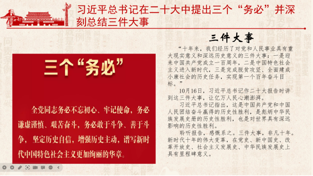 黨的二十大是總結(jié)十年來中國特色社會(huì)主義建設(shè)的成果,并對第二個(gè)奮斗目標(biāo)做出了規(guī)劃部署。骨干培訓(xùn)會(huì)上主要從大會(huì)主題,三個(gè)務(wù)必,三件大事,解決歷史周期律問題新的方案,兩個(gè)“行”,和黨和國家的中心任務(wù)等角度,結(jié)合以往黨的重大會(huì)議,深入剖析了二十大“新”在哪里,對黨的二十大精神做出了深刻的解讀。激發(fā)廣大團(tuán)干部關(guān)心國家大事大事的熱情,使廣大團(tuán)干部能更好的學(xué)習(xí)宣傳貫徹落實(shí)黨的二十大的精神。