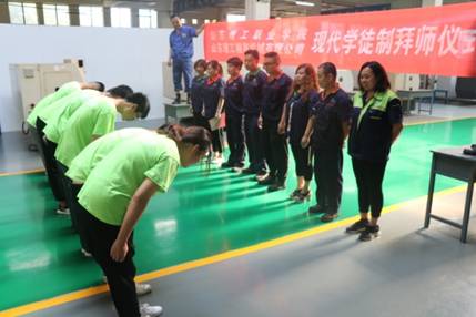 歡迎儀式后,在理工精密公司生產(chǎn)現(xiàn)場(chǎng),舉行了簡(jiǎn)短拜師活動(dòng)。通過拜師活動(dòng),明確了師傅與學(xué)徒關(guān)系,同學(xué)們對(duì)師傅的敬畏油然而生,將有助于幫助提升學(xué)生們的道德修養(yǎng)和職業(yè)素養(yǎng)。按照現(xiàn)代學(xué)徒制人才培養(yǎng)教學(xué)計(jì)劃,同學(xué)將在理工精密進(jìn)行安全教育、企業(yè)管理、崗位技能培訓(xùn)后進(jìn)行跟崗學(xué)習(xí)活動(dòng),在師傅指導(dǎo)下進(jìn)行職業(yè)技能的訓(xùn)練和學(xué)習(xí)。