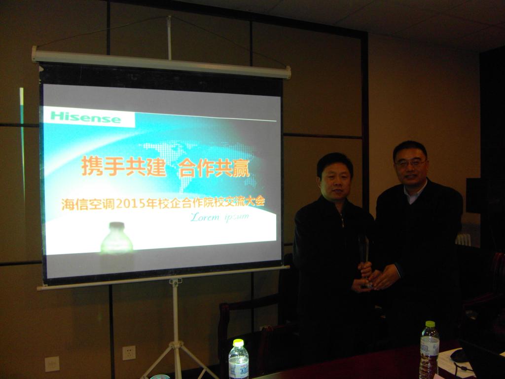 | 海信(山東)空調(diào)有限公司為學院頒發(fā)了“2015年校企合作核心院校”獎杯 |