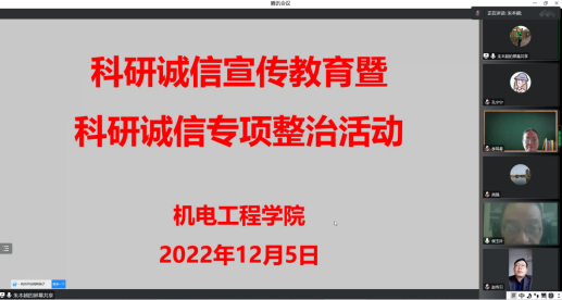 按照學校科研處《關(guān)于開展科研誠信專項整治活動的通知》要求及科研管理工作會議精神,2022年12月5日下午,機電工程學院組織召開了科研誠信宣傳教育暨科研誠信專項整治活動線上專題會議,會議由侯玉葉院長主持,學院領(lǐng)導李鳳春書記、趙傳貝副書記出席,全體在職在崗教師參會。