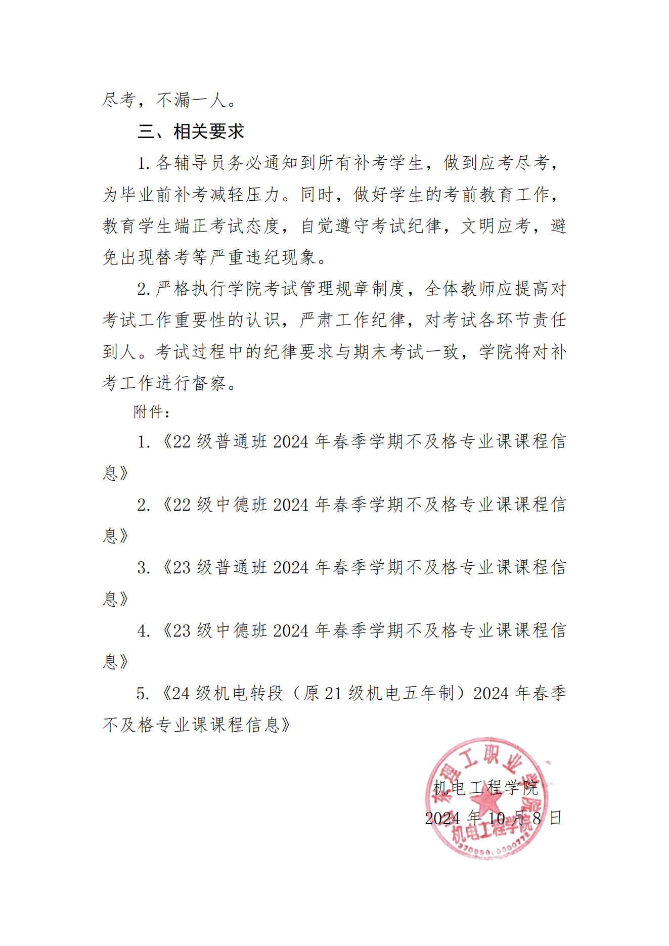 機電工程學(xué)院關(guān)于做好2024年秋季學(xué)期補考工作的通知