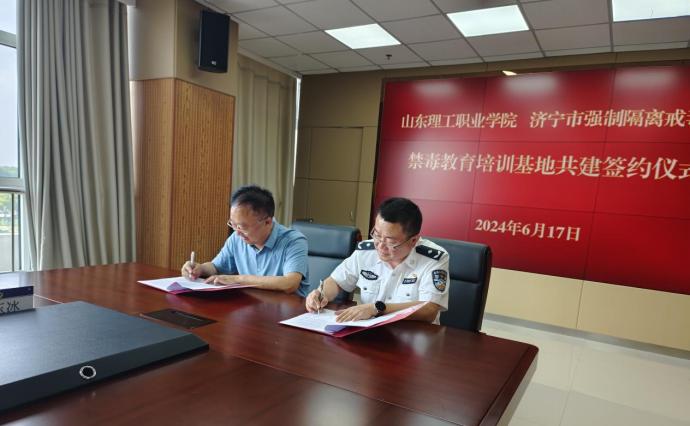 揭牌儀式及座談會(huì)上,徐鋒書記首先對(duì)濟(jì)寧市強(qiáng)制隔離戒毒所黨委書記、所長尹林壯,政委張煒,副所長黃倫偉等同志的熱情接待表示誠摯感謝。徐鋒書記向尹林壯所長等與會(huì)同志介紹了山東理工職業(yè)學(xué)院學(xué)校、專業(yè)及學(xué)生基本情況,并表明了山東理工職業(yè)學(xué)院領(lǐng)導(dǎo)及教師一行的目的和意義,表示希望通過禁毒教育培訓(xùn)基地共建建立長期合作關(guān)系,加強(qiáng)青年大學(xué)生識(shí)毒、防毒教育,為同學(xué)們健康平安成長保駕護(hù)航。尹林壯所長向我們介紹了關(guān)于濟(jì)寧市強(qiáng)制隔離戒毒所的基本情況、所區(qū)布置及功能,并希望發(fā)揮好戒毒所在教育培訓(xùn)青年大學(xué)生中的作用,為濟(jì)寧社會(huì)穩(wěn)定和諧貢獻(xiàn)力量。隨后,山東理工職業(yè)學(xué)院黨委副書記徐鋒與濟(jì)寧市強(qiáng)制隔離戒毒所黨委書記、所長簽訂了合作協(xié)議并進(jìn)行了揭牌。
