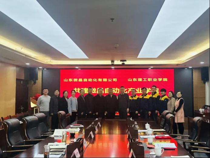 12月26日下午,山東理工職業(yè)學院與山東微晶自動化有限公司合作共建微晶自動化產(chǎn)業(yè)學院簽約揭牌儀式在學院718會議室隆重舉行。山東理工職業(yè)學院黨委書記李洪文,黨委委員、副書記徐鋒,黨委委員、副校長周宏強等學院領導,教務處、科研處、機電工程學院主要負責人以及山東微晶自動化有限公司總經(jīng)理王軍、生產(chǎn)總監(jiān)顏飛、技術總監(jiān)陳新全、售后服務經(jīng)理蔡旺等企業(yè)高管出席儀式,機電工程學院相關科室和各專業(yè)帶頭人列席儀式。